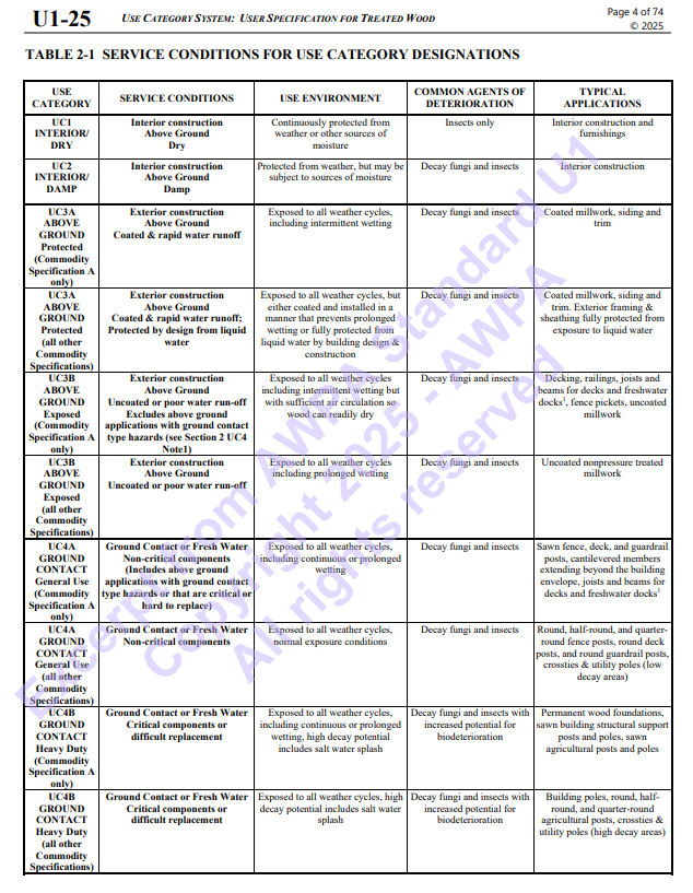 When you specify treated wood, this is the standard that defines the appropriate treatment chemicals and chemical retentions depending on the exposure condition and bio-hazard, which the AWPA has summarized into a Use Category (UC) system. Figure 1 is a clip from the AWPA web site that gives a glimpse at the UC system. As the UC rating increases from UC1 to UC5, the chemical retention increases because the bio-hazard is increasing. Corrosion hazards are directly related to the combination of treatment chemical, treatment chemical retention and use environment.