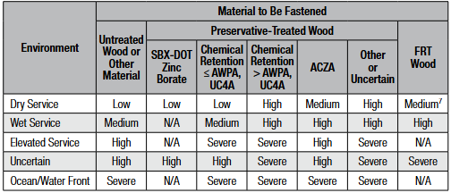 It is important to note that the Corrosion Resistance Classifications are not associated with specific applications. Rather, the ratings are based on the integrated effects of the environment and the wood treatment where the chemical retentions given in the AWPA Use Category system play an important role in the ratings. This makes it relatively straightforward to select hardware that is adequate for a design environment.