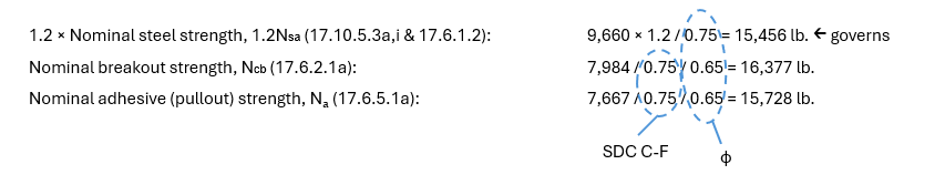 Because the steel failure mode governs (1.2Nsa = 15,456 lb.) and the steel in this design example is ductile (ASTM A193 Gr. B8/B8M (304/316 Stainless Steel)), the anchorage is considered ductile. It’s important to note that the nominal strength does not include the material reduction factor, φ, which is 0.75 for steel and 0.65 for breakout and adhesive bond. It also does not include the 0.75 reduction factor for anchorage located in SDC C – F. This reduction factor accounts for the possibility of increased cracking and spalling in the concrete caused by seismic activity.