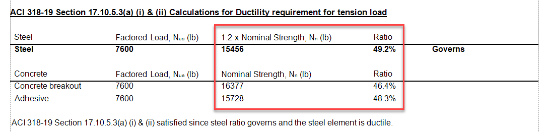 To see whether this anchor system is ductile, we first must determine the nominal strength for each failure mode. The nominal strength provides a better representation than the design strength of the relative expected tensile limit of each failure mode. To qualify an anchor system as ductile, section 17.10.5.3(a)(i)(ii) of ACI 318- 19 requires that the following relative strength conditions be met:
