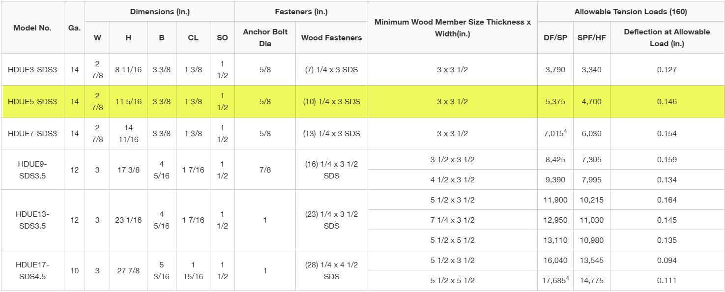 Next, we must choose a holdown. Since ASD values are listed for Simpson Strong-Tie holdowns, we must convert our demand load to an ASD level load. To simplify, we assume 100% seismic loading.