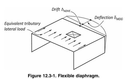 Provision shall be made for the increased shears resulting from horizontal torsion where diaphragms are not flexible. Diaphragms shall be considered flexible for the purposes of this paragraph when the maximum lateral deformation of the diaphragm is more than two times the average story drift of the associated story. This may be determined by comparing the computed midpoint in-plane deflection of the diaphragm under lateral load with the story drift of adjoining vertical resisting elements under equivalent tributary lateral load.
