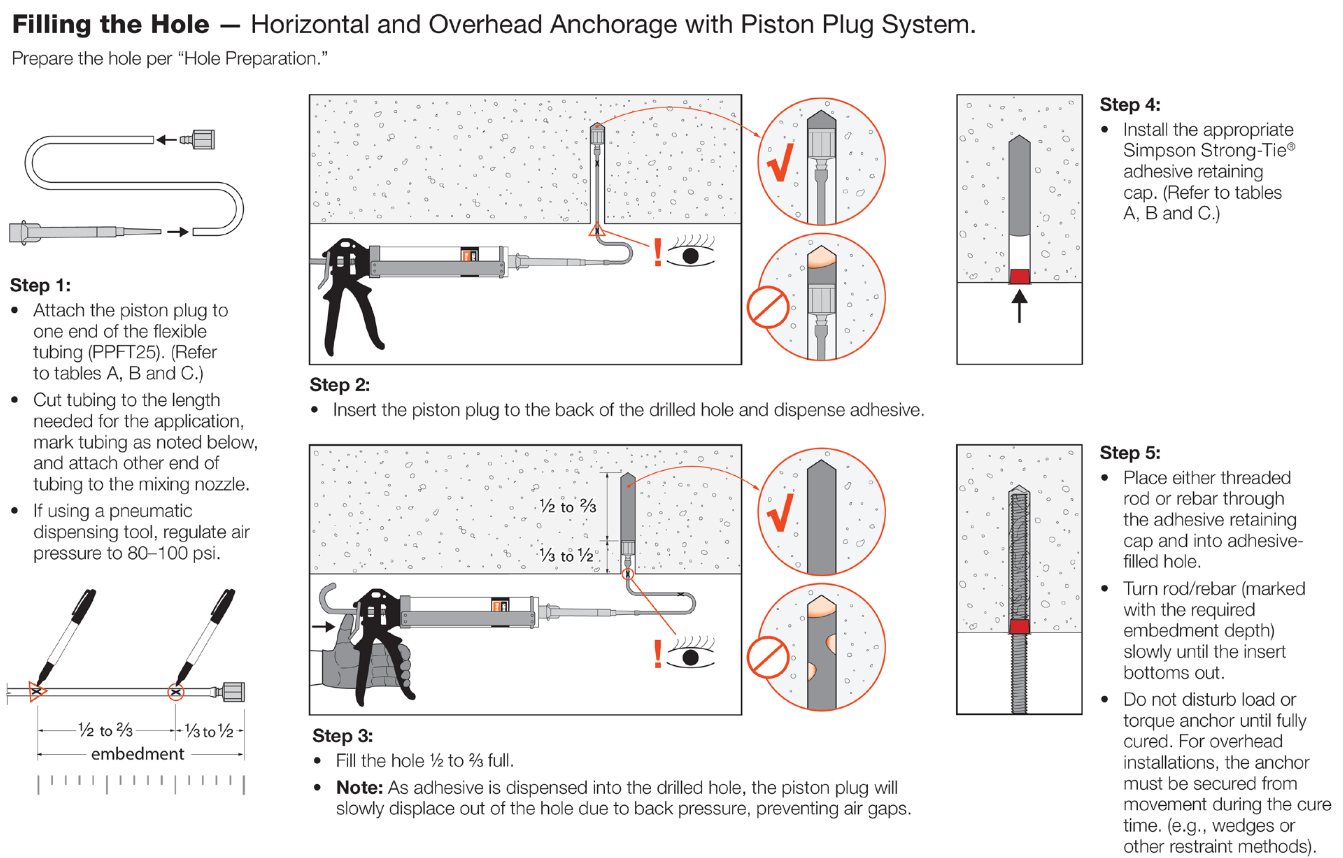 To aid the installer, Simpson Strong-Tie offers a piston plug adhesive delivery system (Figure 3). Consisting of pre-packaged flexible tubing, piston plugs and an adhesive retaining cap, this system allows installers to more easily and consistently make high-quality installations while completing their work efficiently. The installation sequence is provided in Figure 4.