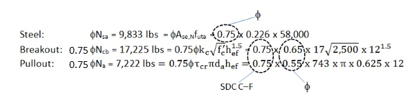 To understand why, we need to look at the nominal strength (not the design strength) of the different anchor failure modes. But first let’s examine the equations used to determine the design strength values above: