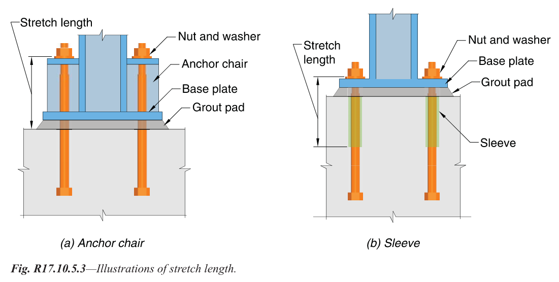Now steel governs, but one more thing is required. As shown in Figure 3, Section 17.10.5.3.(a).(iii) of Chapter 17 also requires that the rod be made of ductile steel and have a stretch length of at least eight times the insert diameter (8d). Chapter 17 defines a ductile steel element as exhibiting an elongation of at least 14% and a reduction in area of at least 30%. ASTM F1554 meets this requirement for all three grades of steel (Grade 36, 55 and 105) with the exception of Grade 55 for anchor nominal sizes greater than 2”. Research has shown that a sufficient stretch length helps ensure that an anchor can experience significant yielding and plastic deformation during tensile loading. The threaded rod shown in Figure 1 was tested using a stretch length of 4” (8d). Lastly, section 17.10.5.3.(a).(iv) requires that the anchor be engineered to protect against buckling.